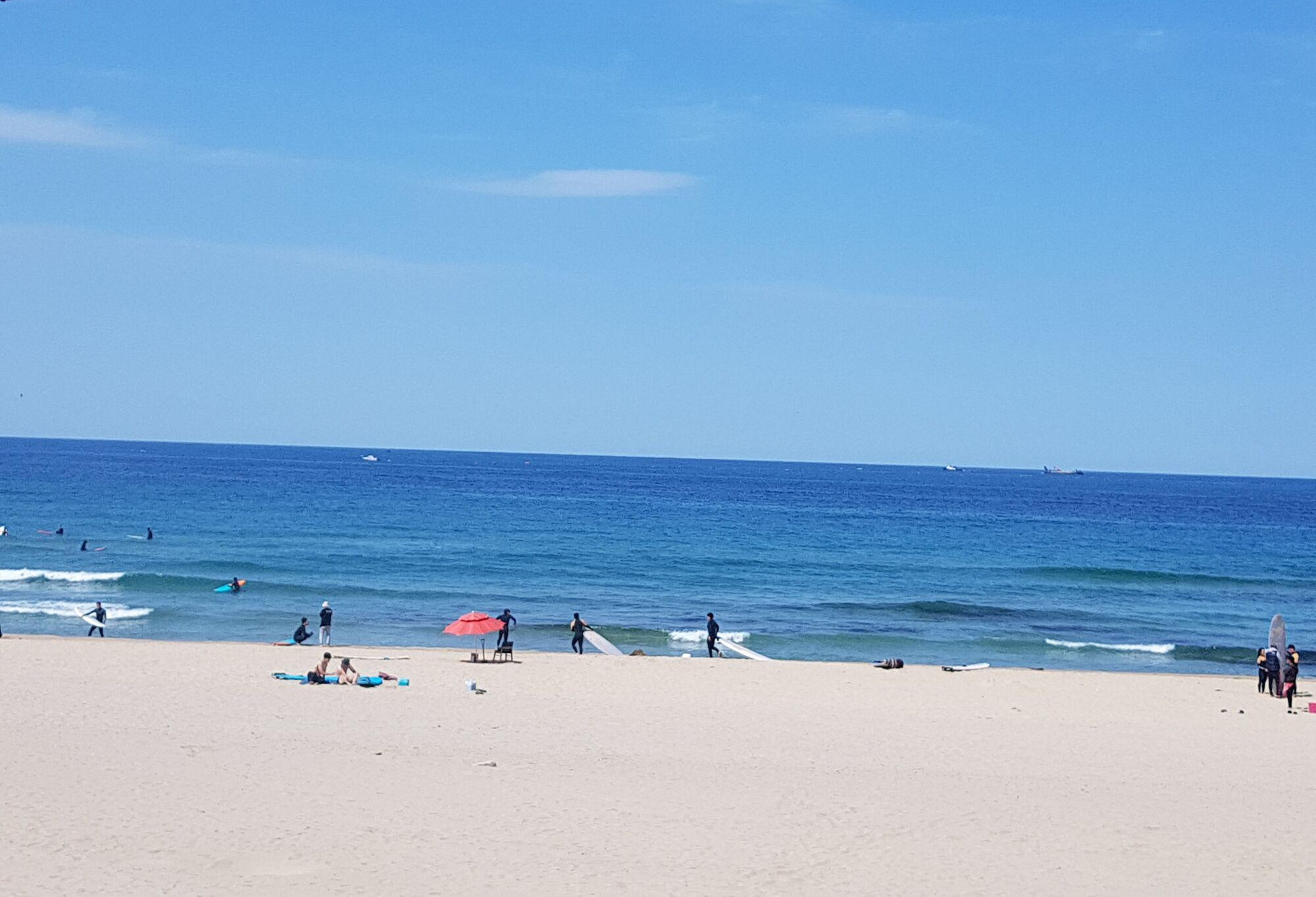 푸른 바다와 서핑을 즐기는 사람들이 한폭의 그림같은 풍광이다.