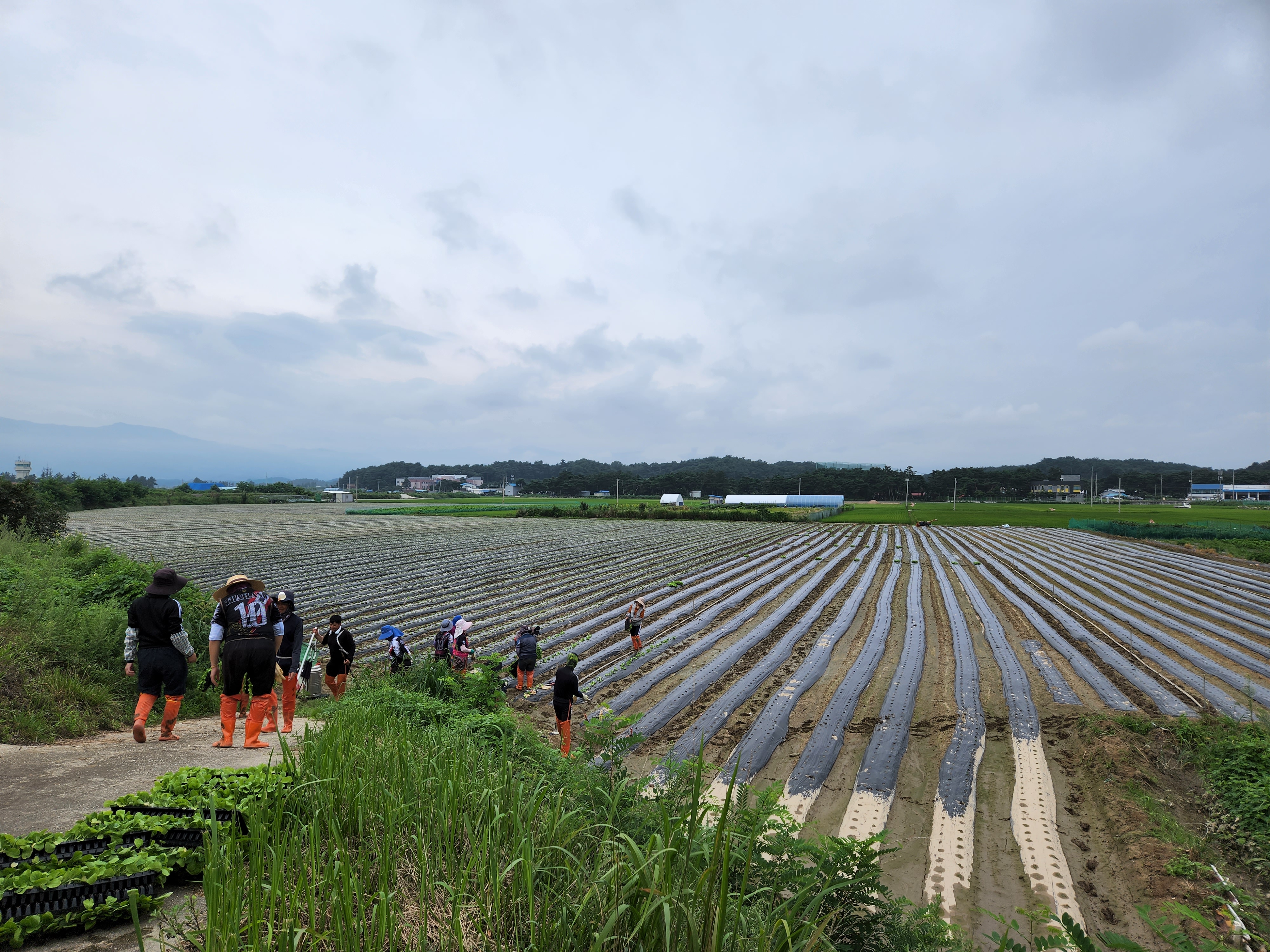 배추 모종하는 인력이 차로 이동하여 밭으로 들어선다.