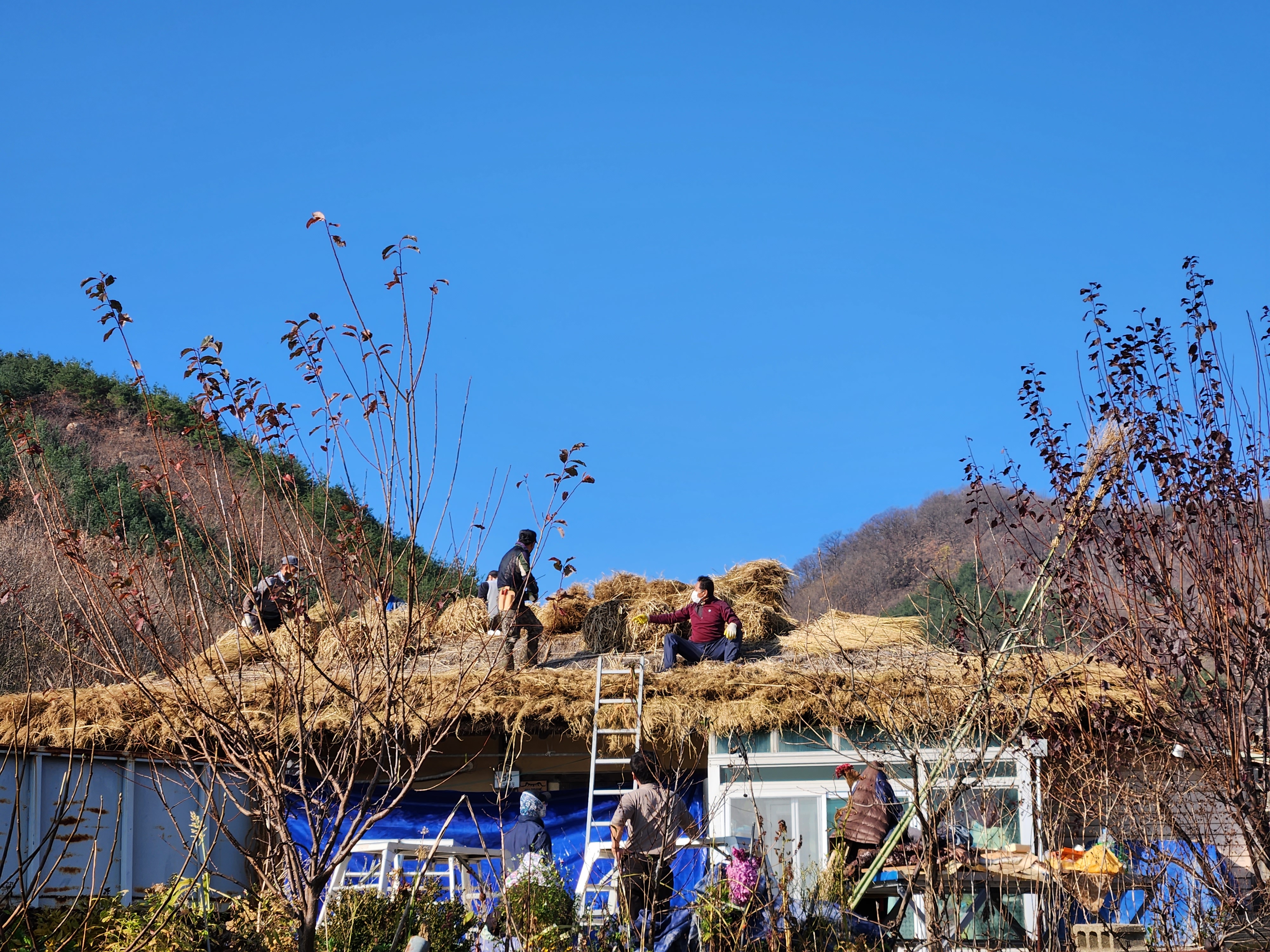 오늘은 초가지붕을 새로 올리는 날인지 일꾼들이