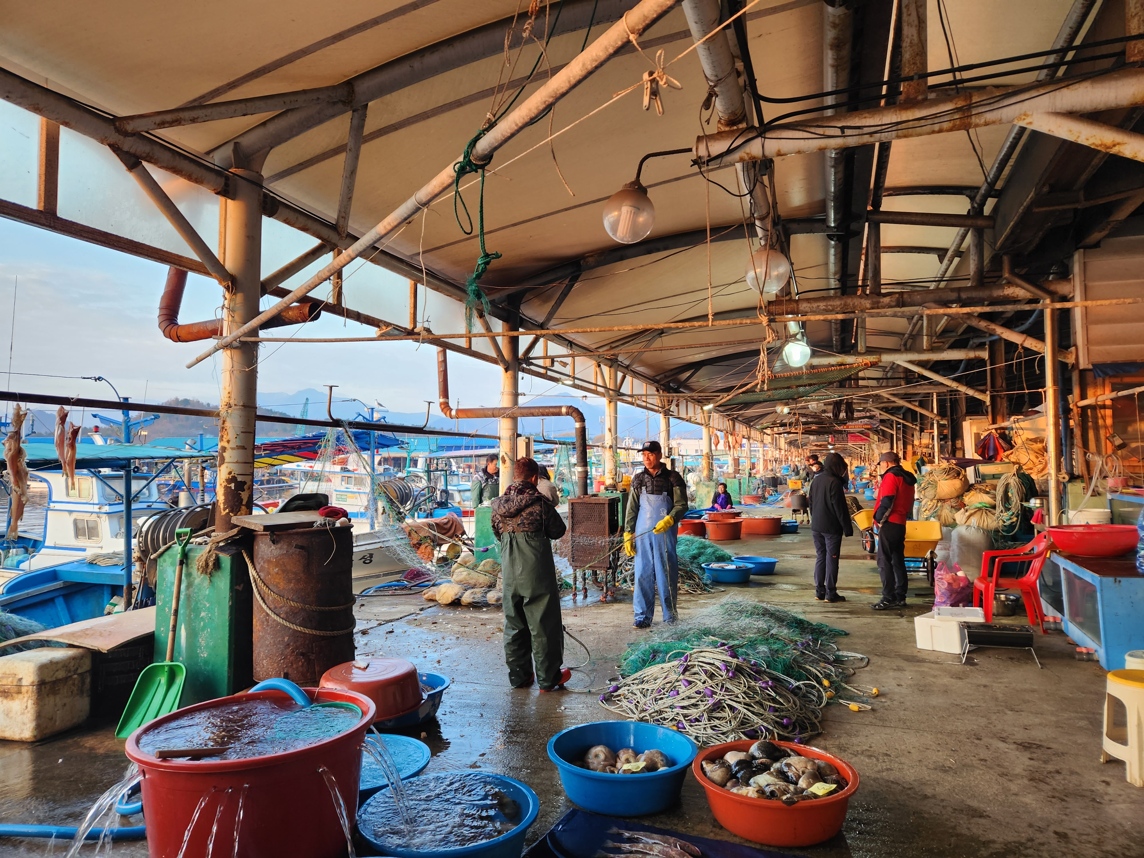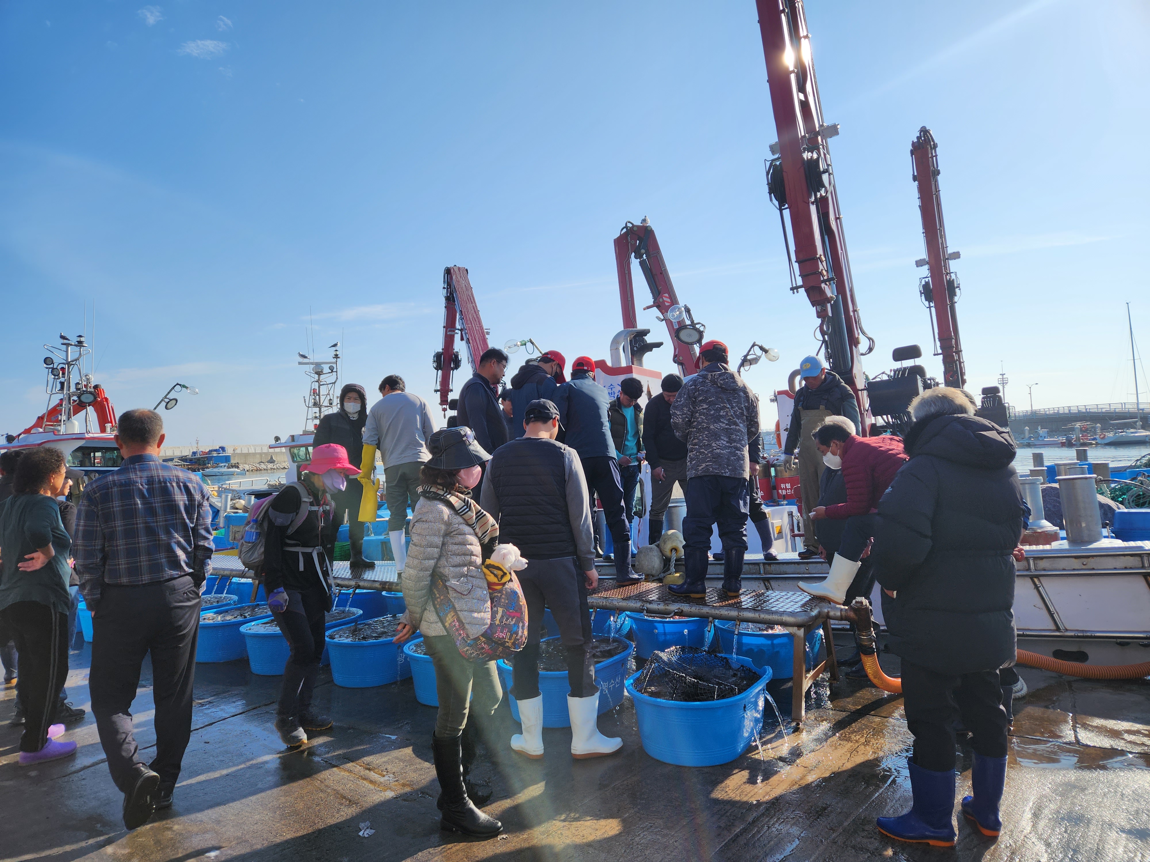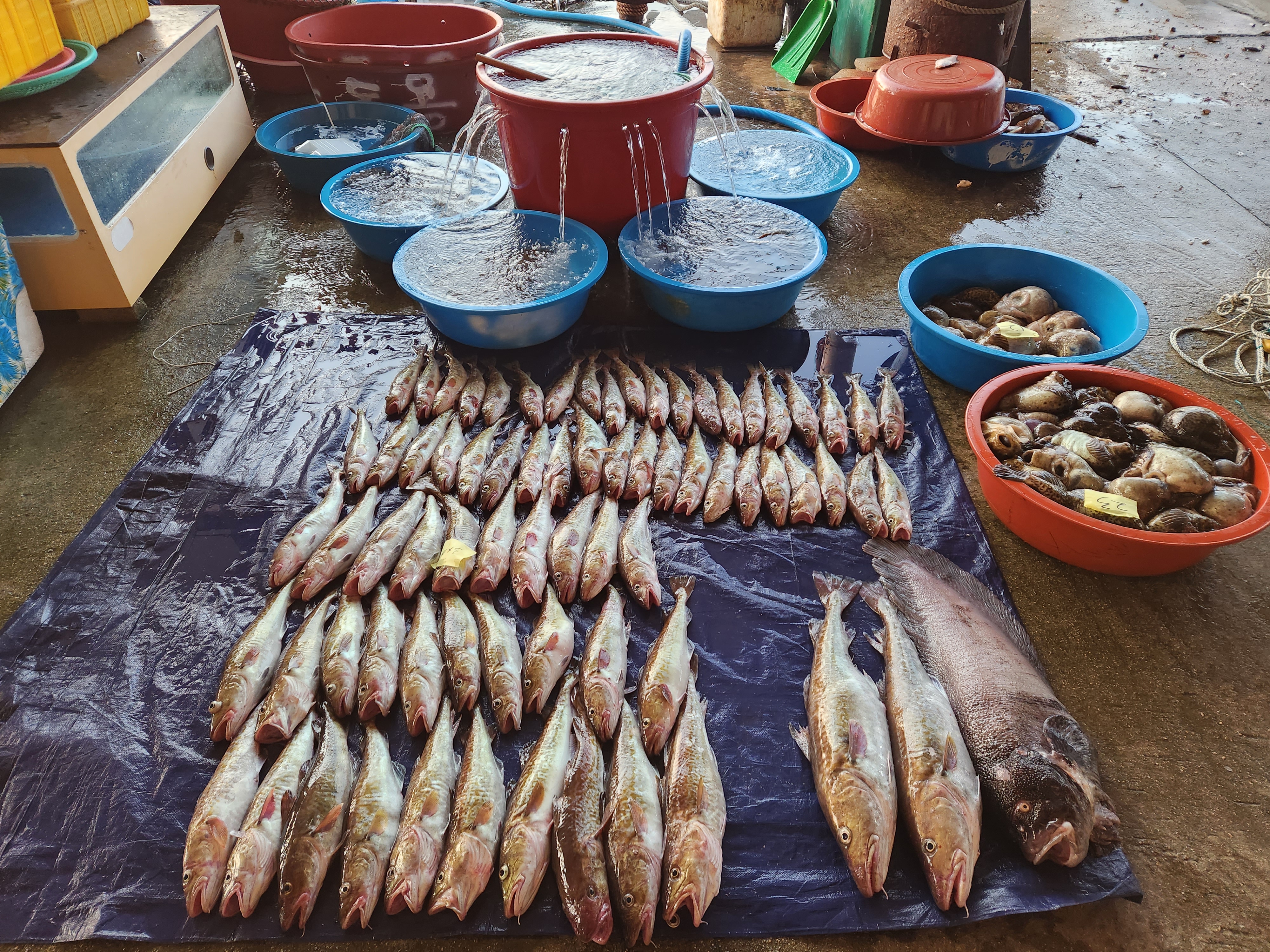 항구에 들어온 배에서 갓 잡아온 물고기를
