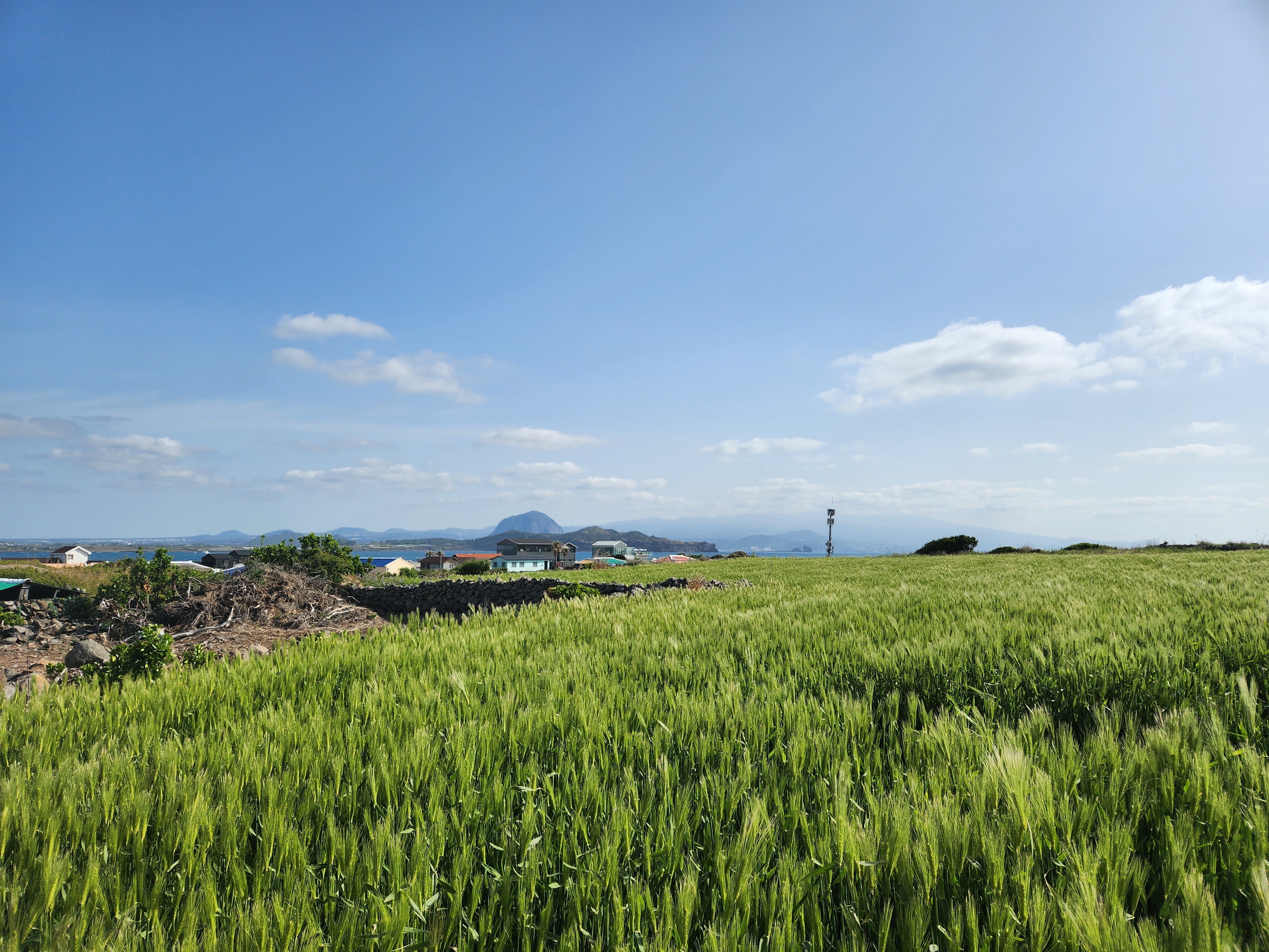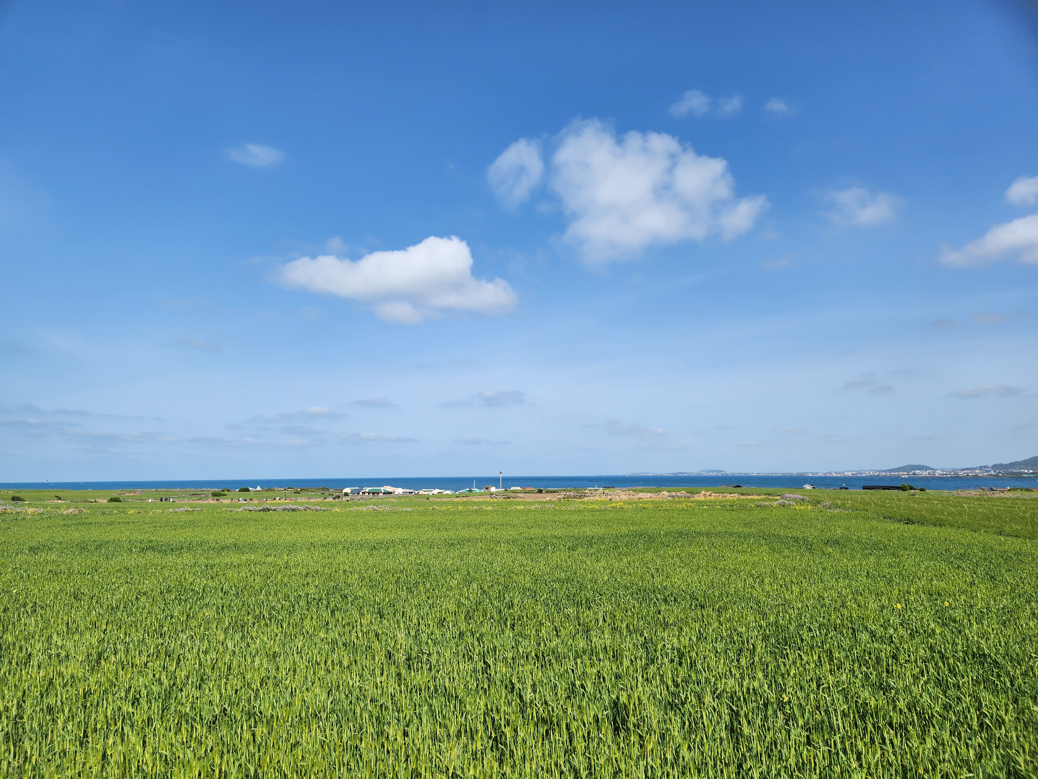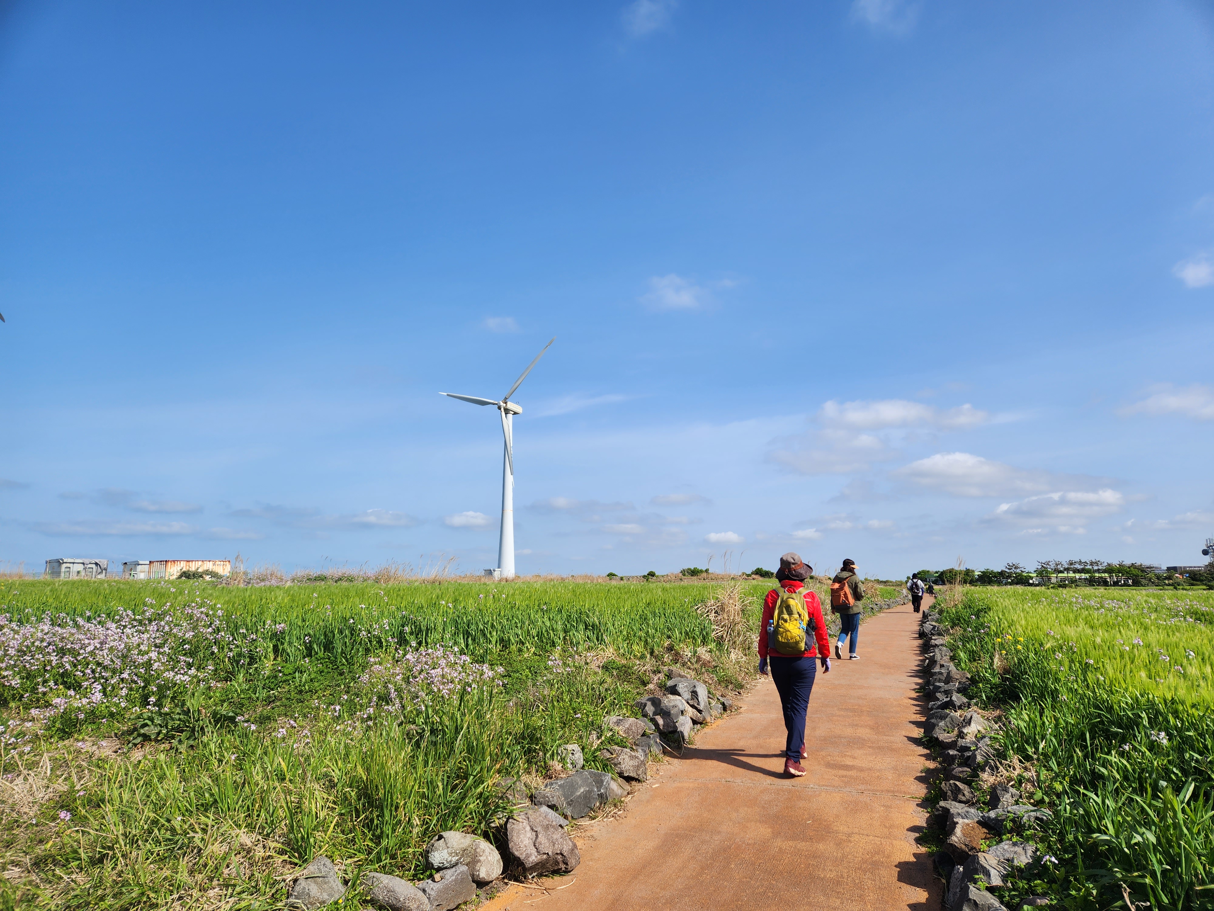 청보리밭과 하얀 풍차, 그리고 파란 하늘에