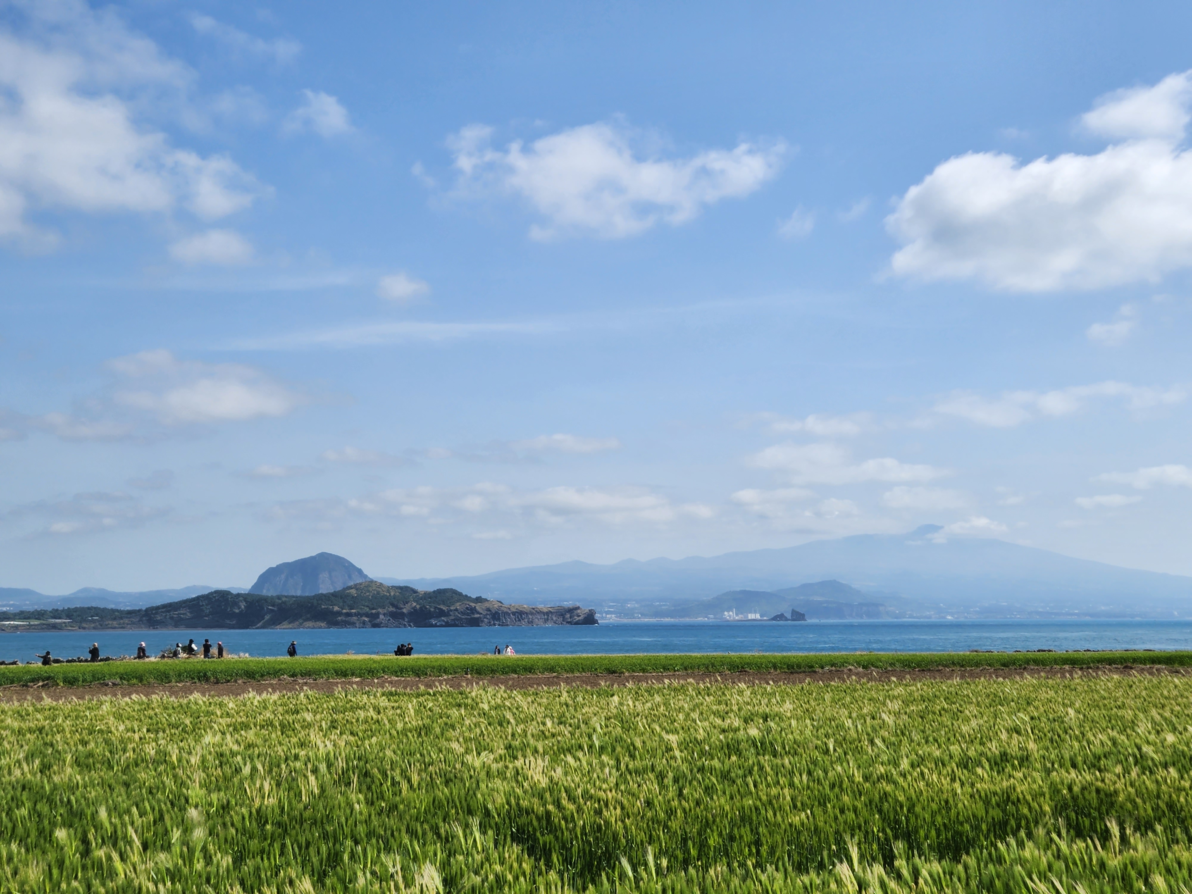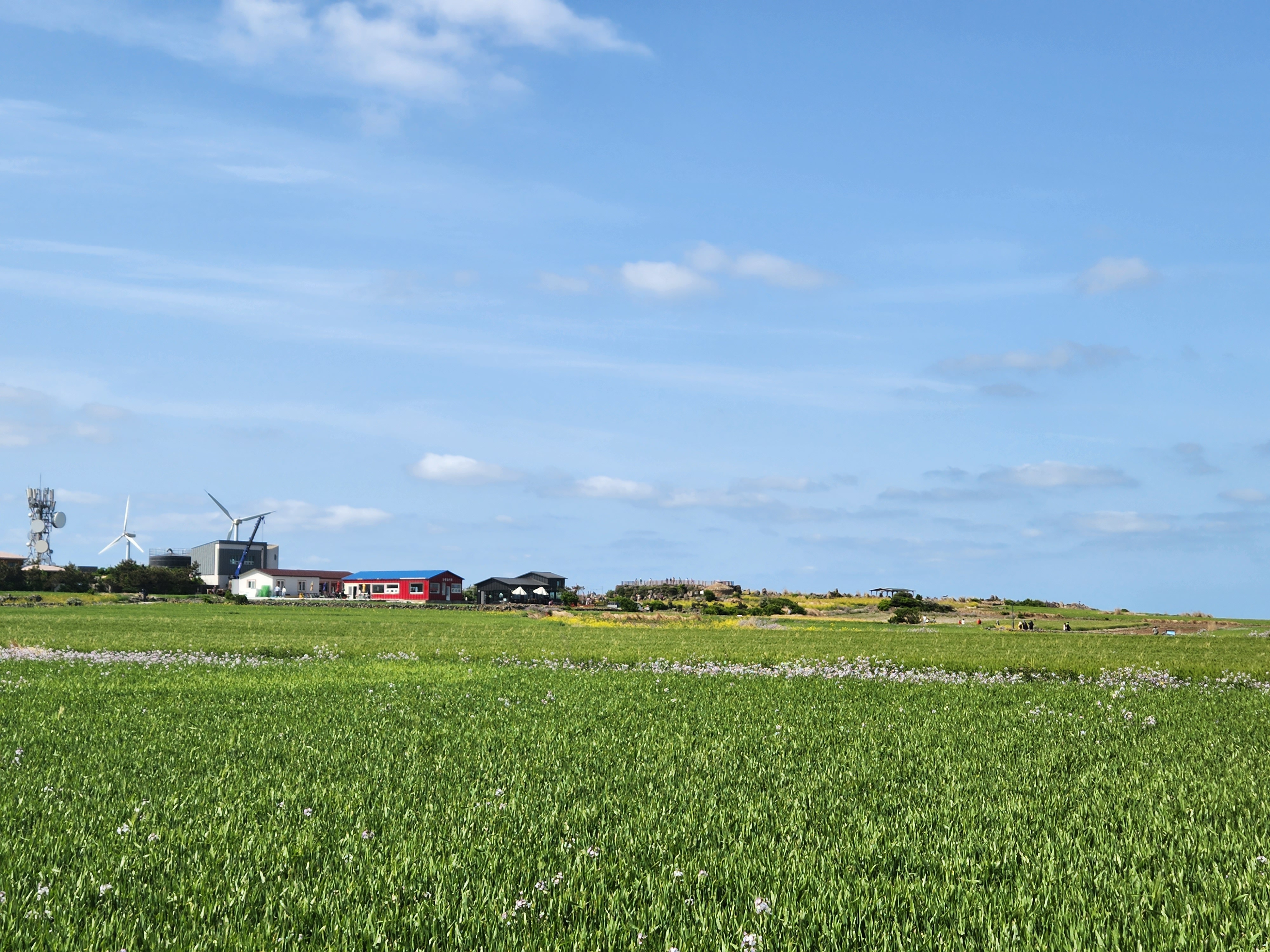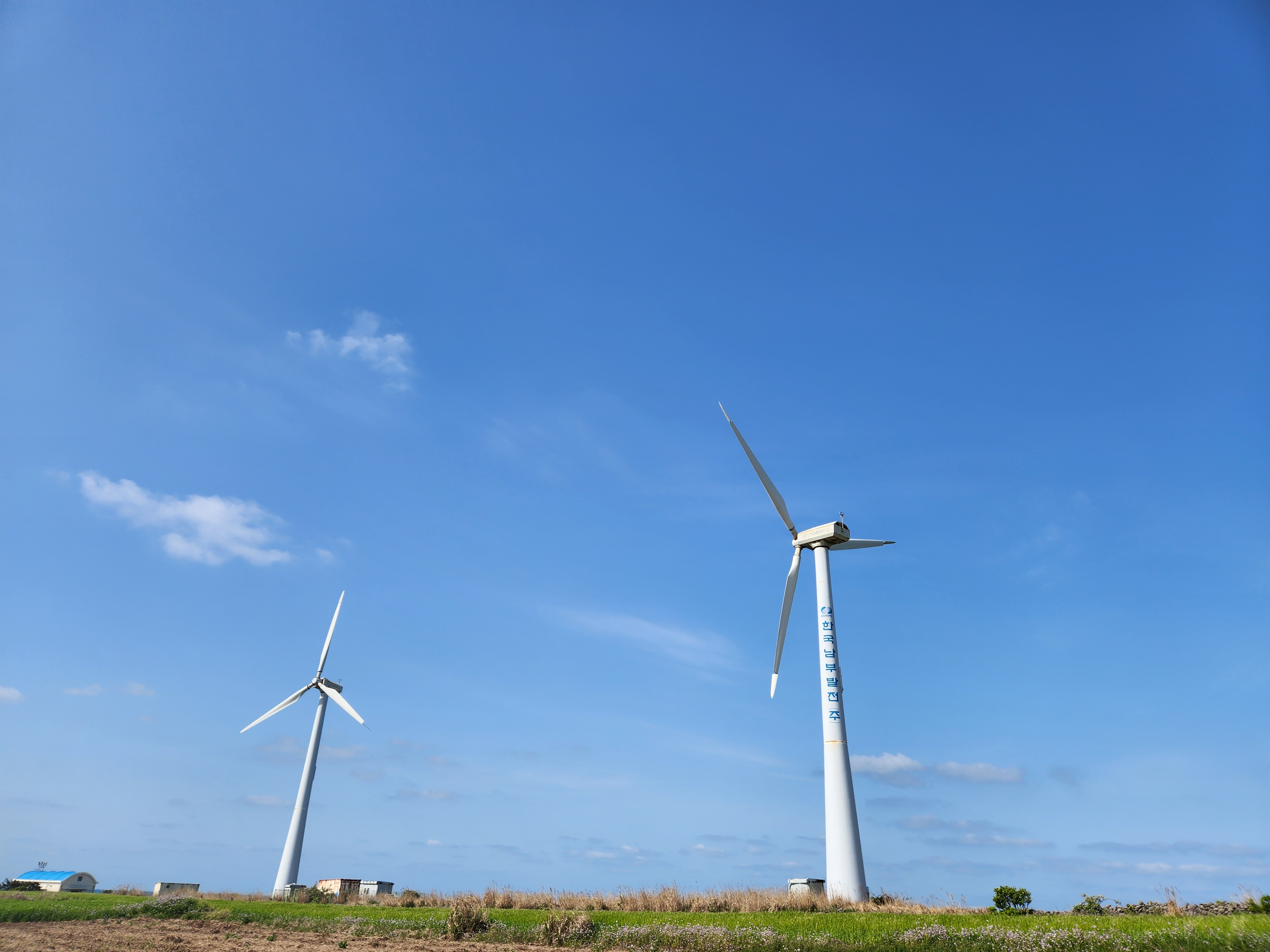 청보리밭과 하얀 풍차, 그리고 파란 하늘에