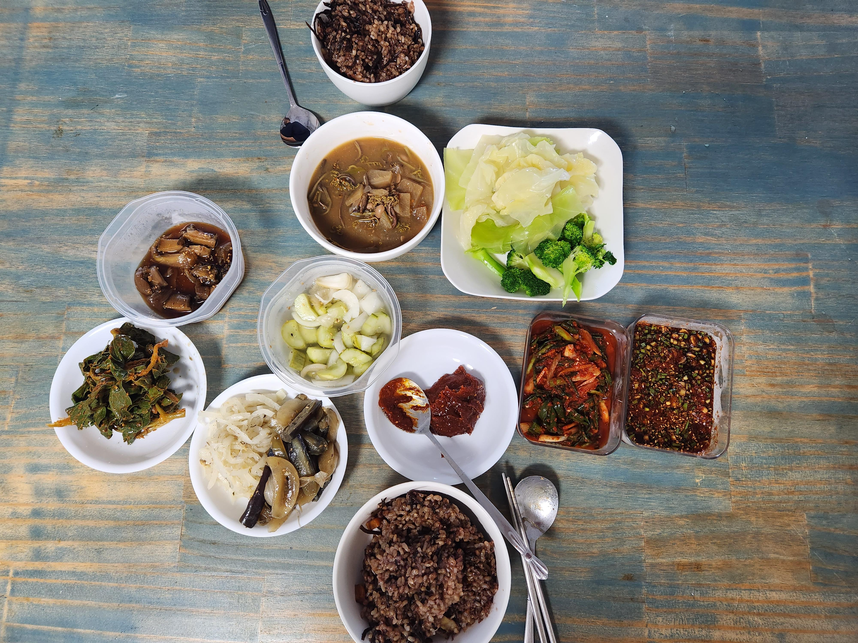 3층에 숙박하시는 부부가 마당에서 양파를 까고 있다.