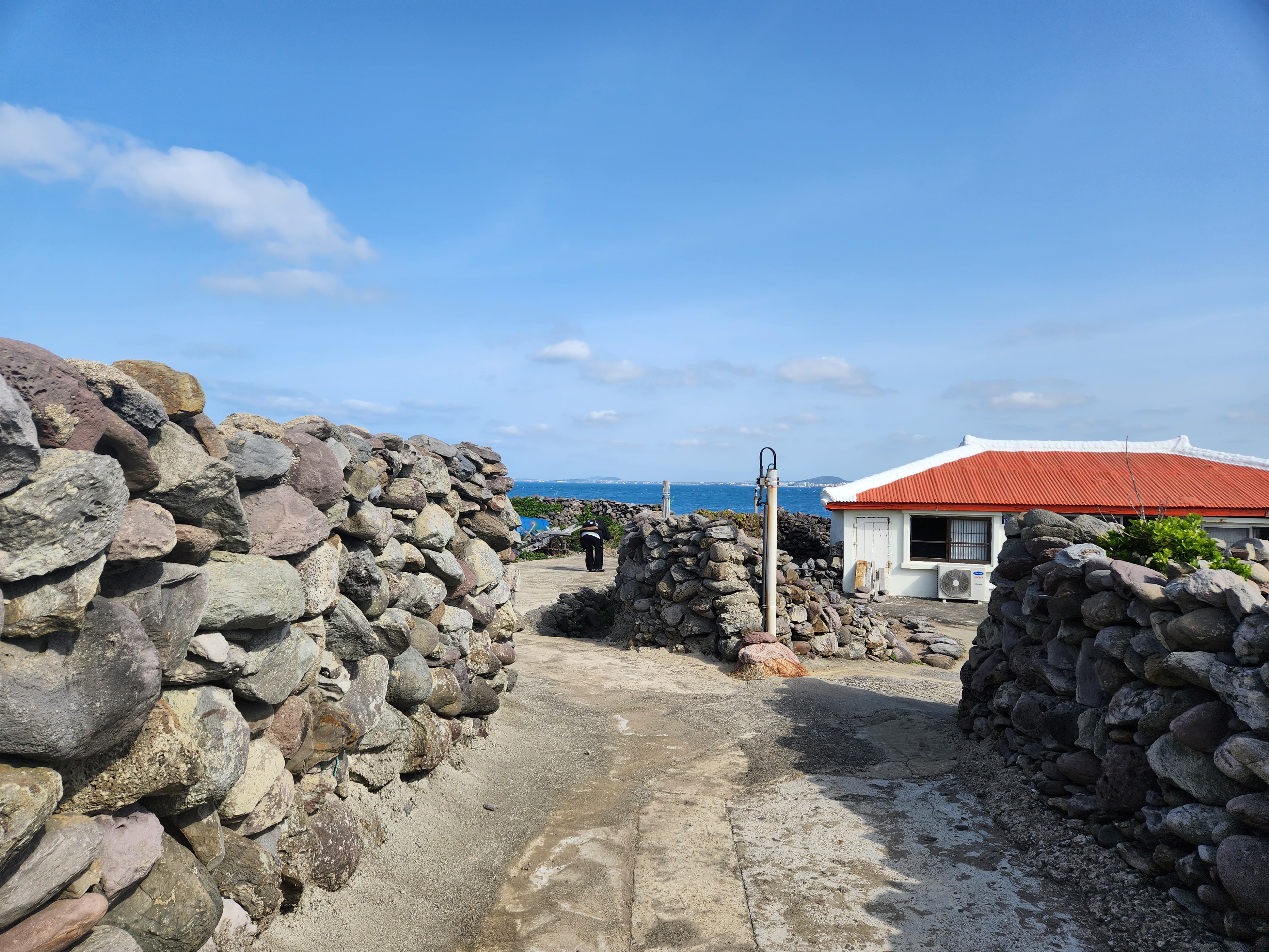 소라와 조개 껍데기로 장식된 멋진 돌담