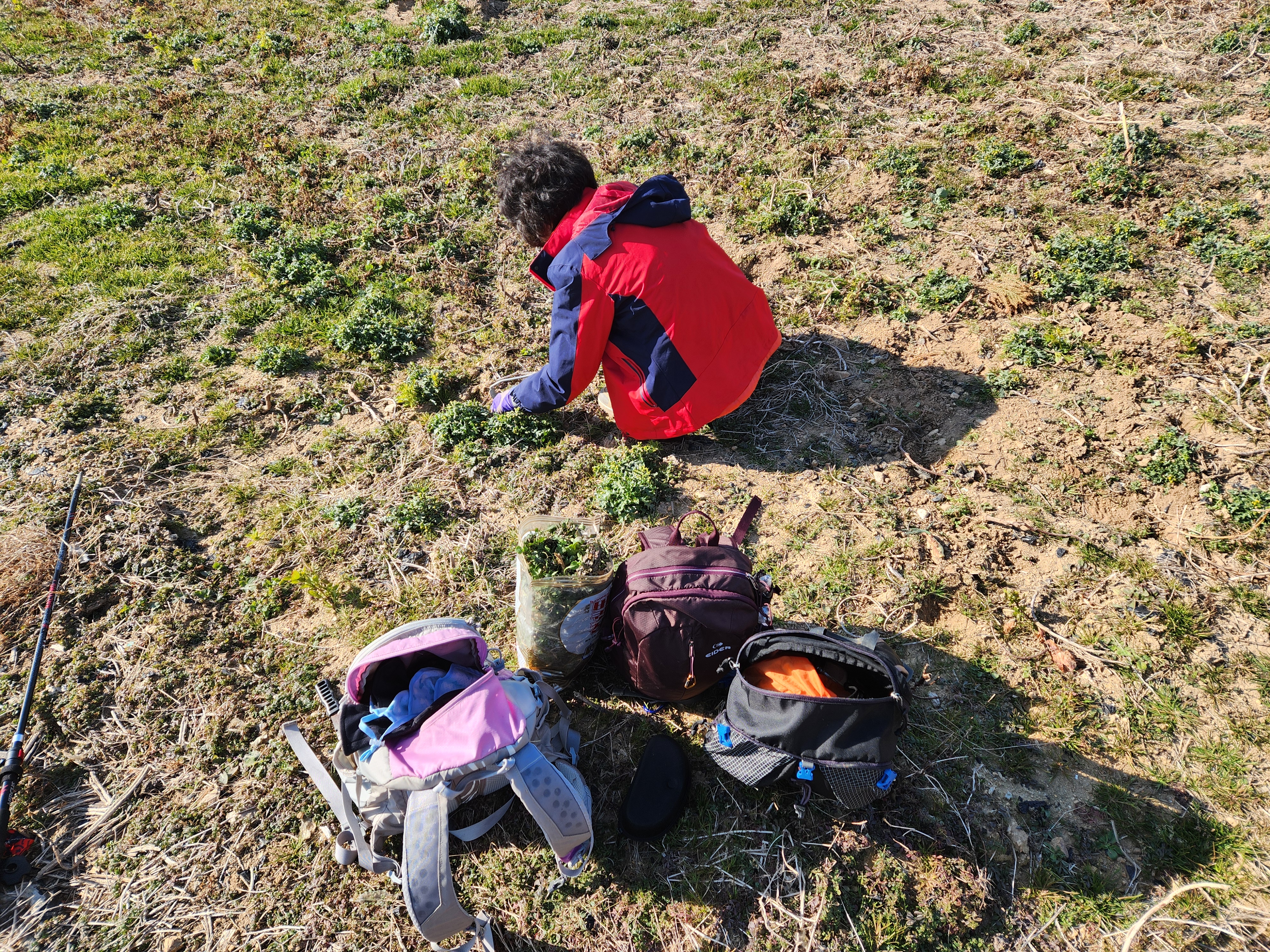 냉이로 묵직해진 배낭을 메고 바삐 걷는 남편