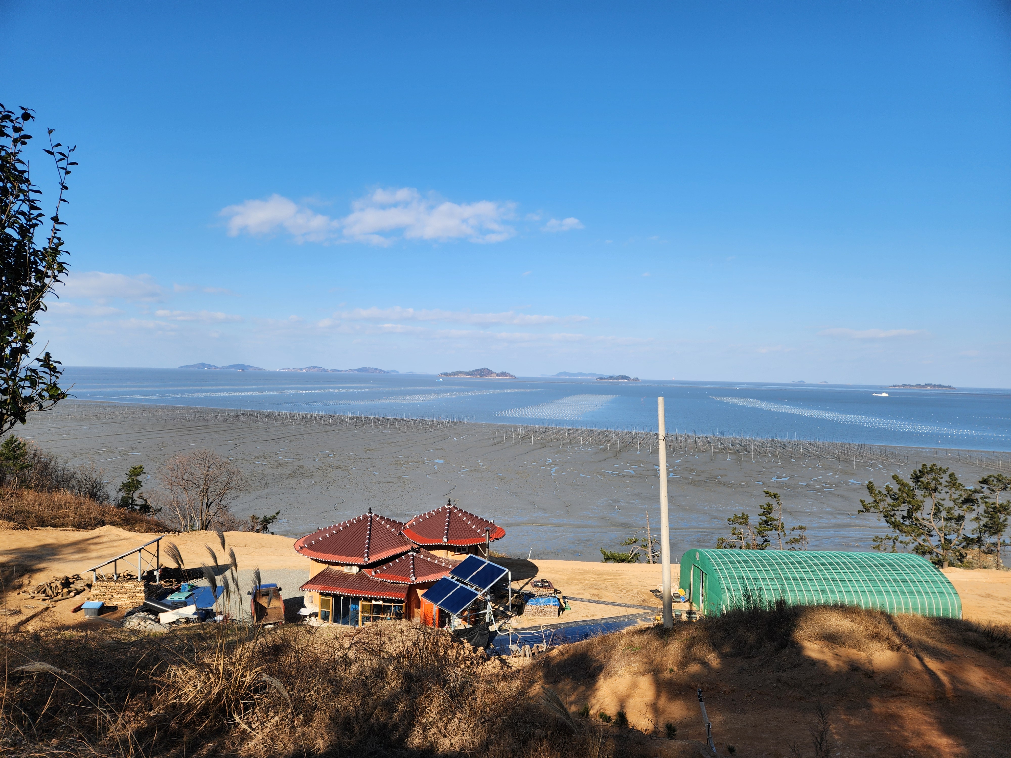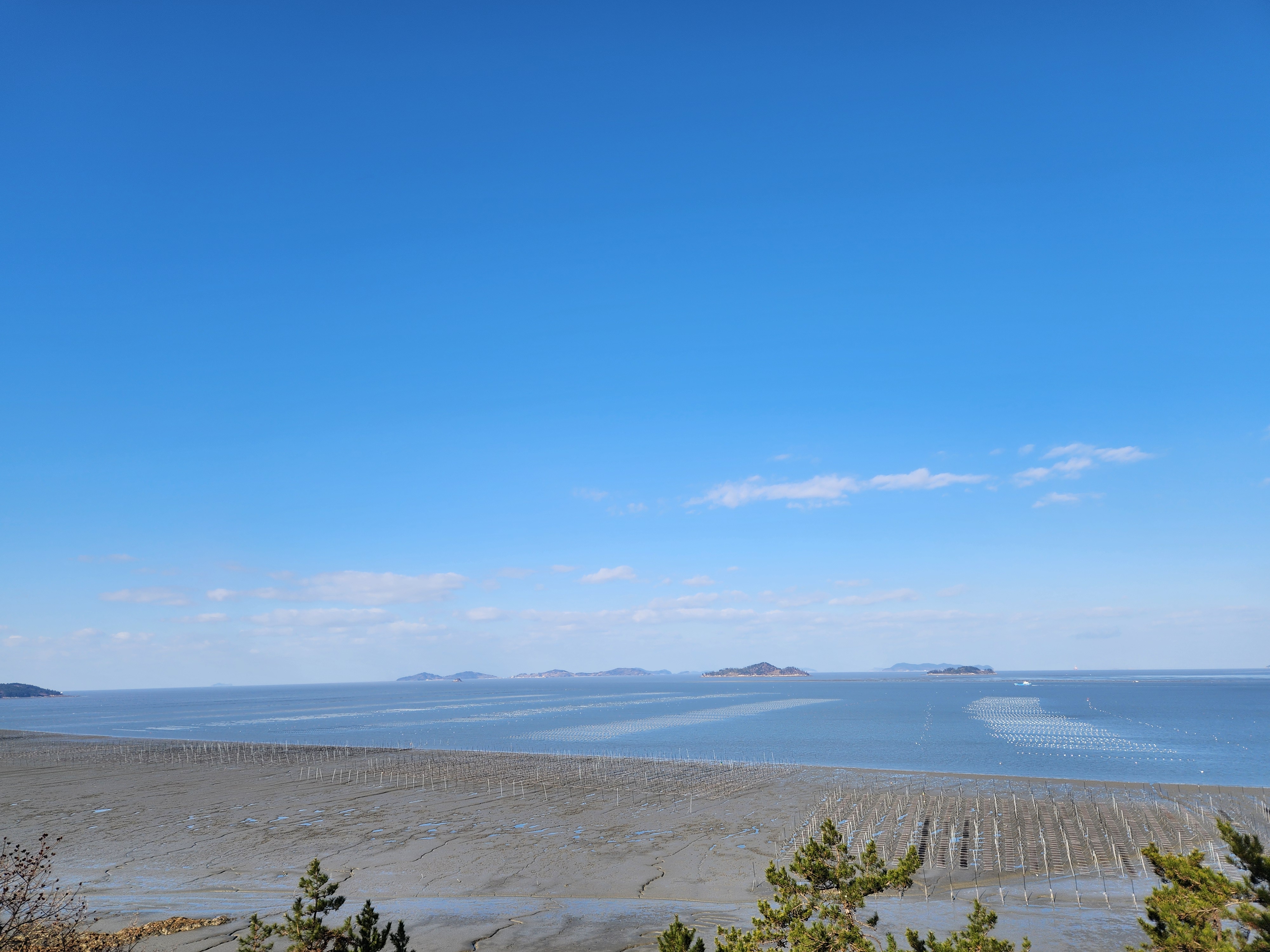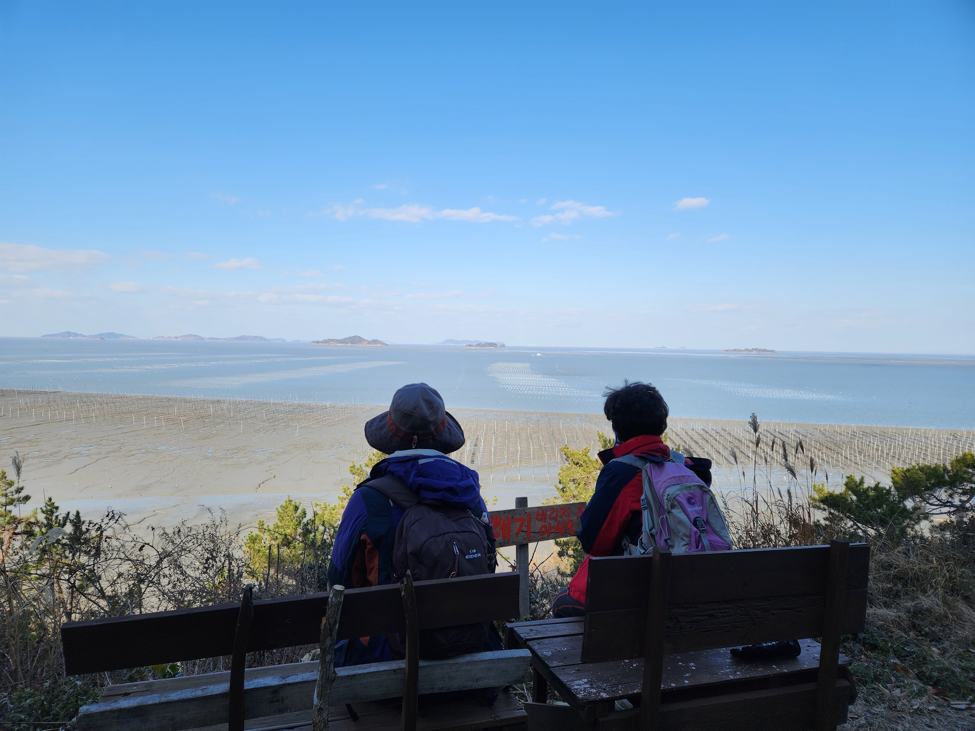 벤치에서 작은 섬들과 바다 양식장을 구경한다.