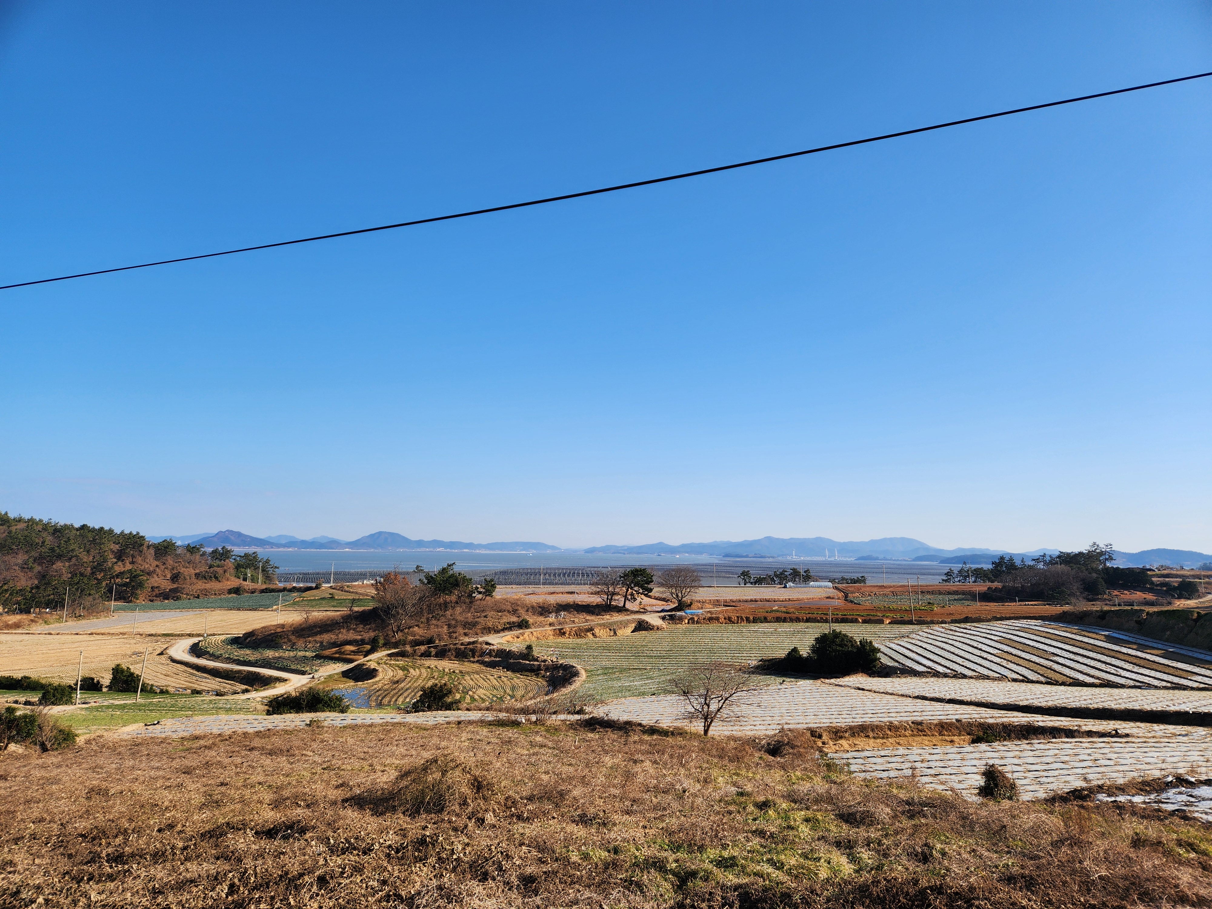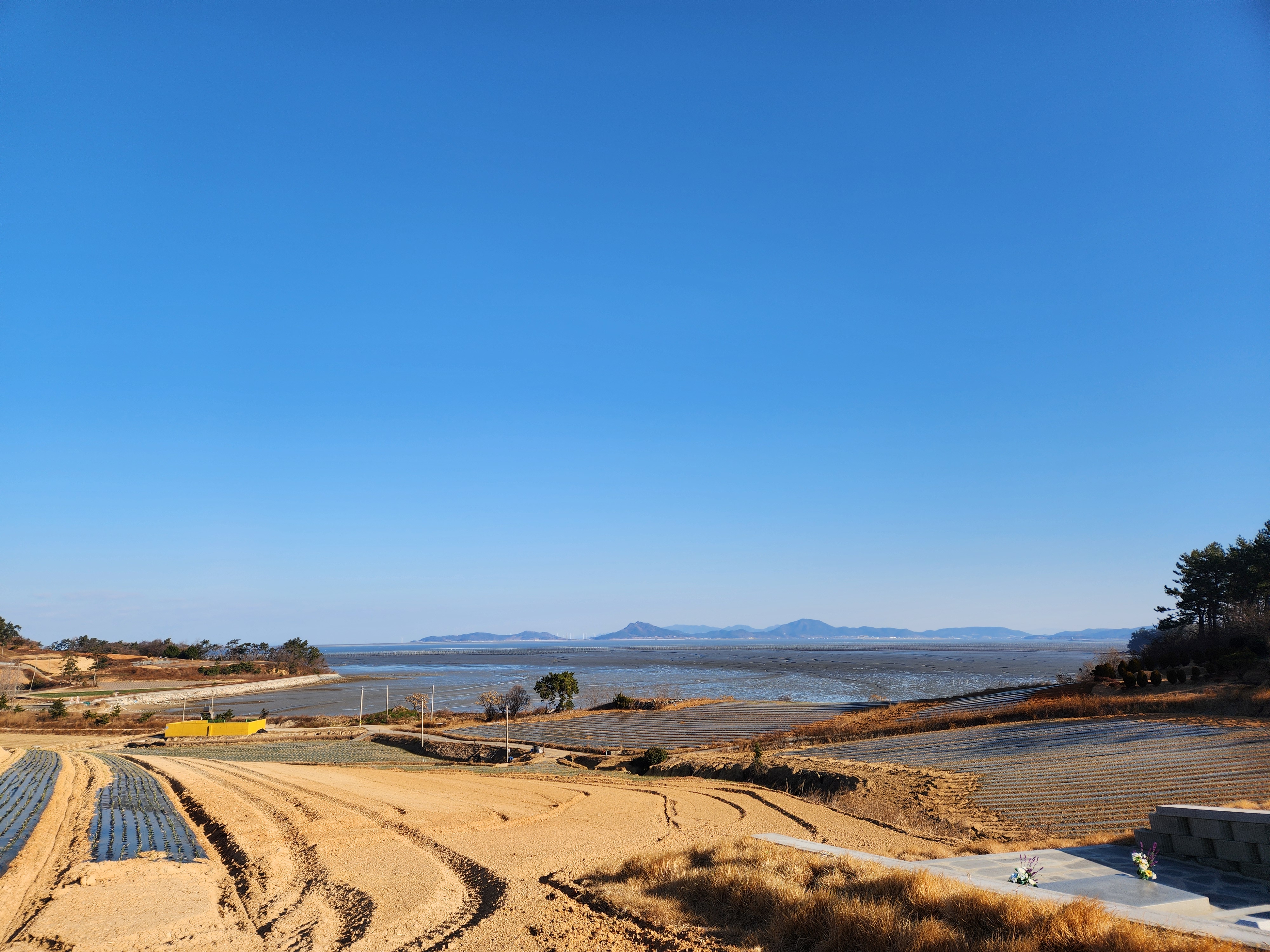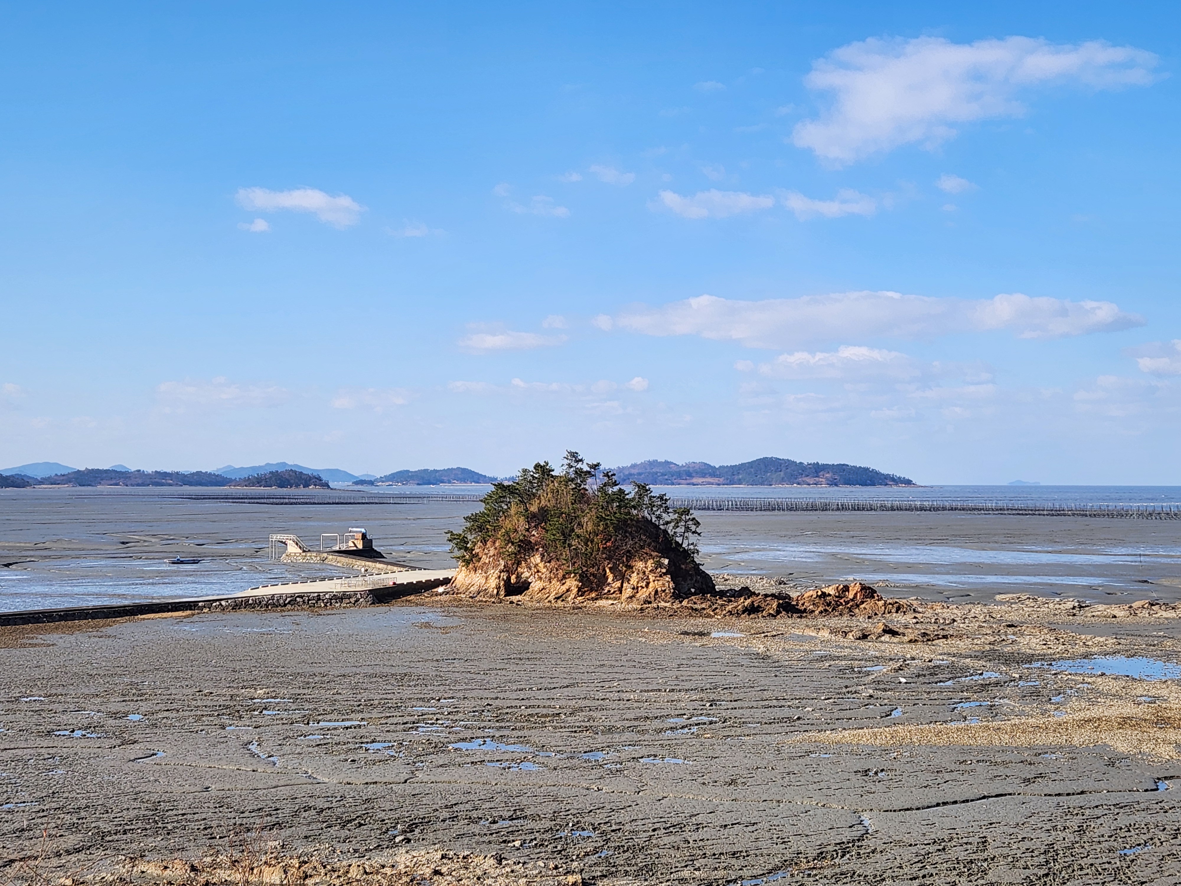 벤치에서 작은 섬들과 바다 양식장을 구경한다.