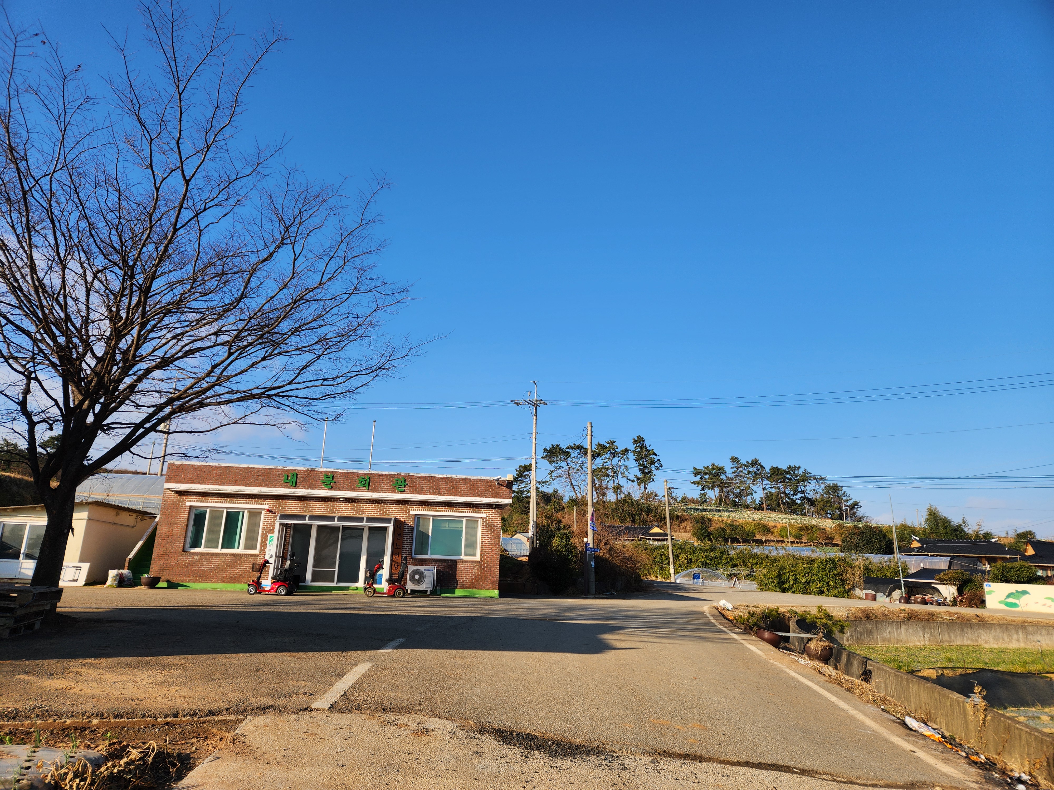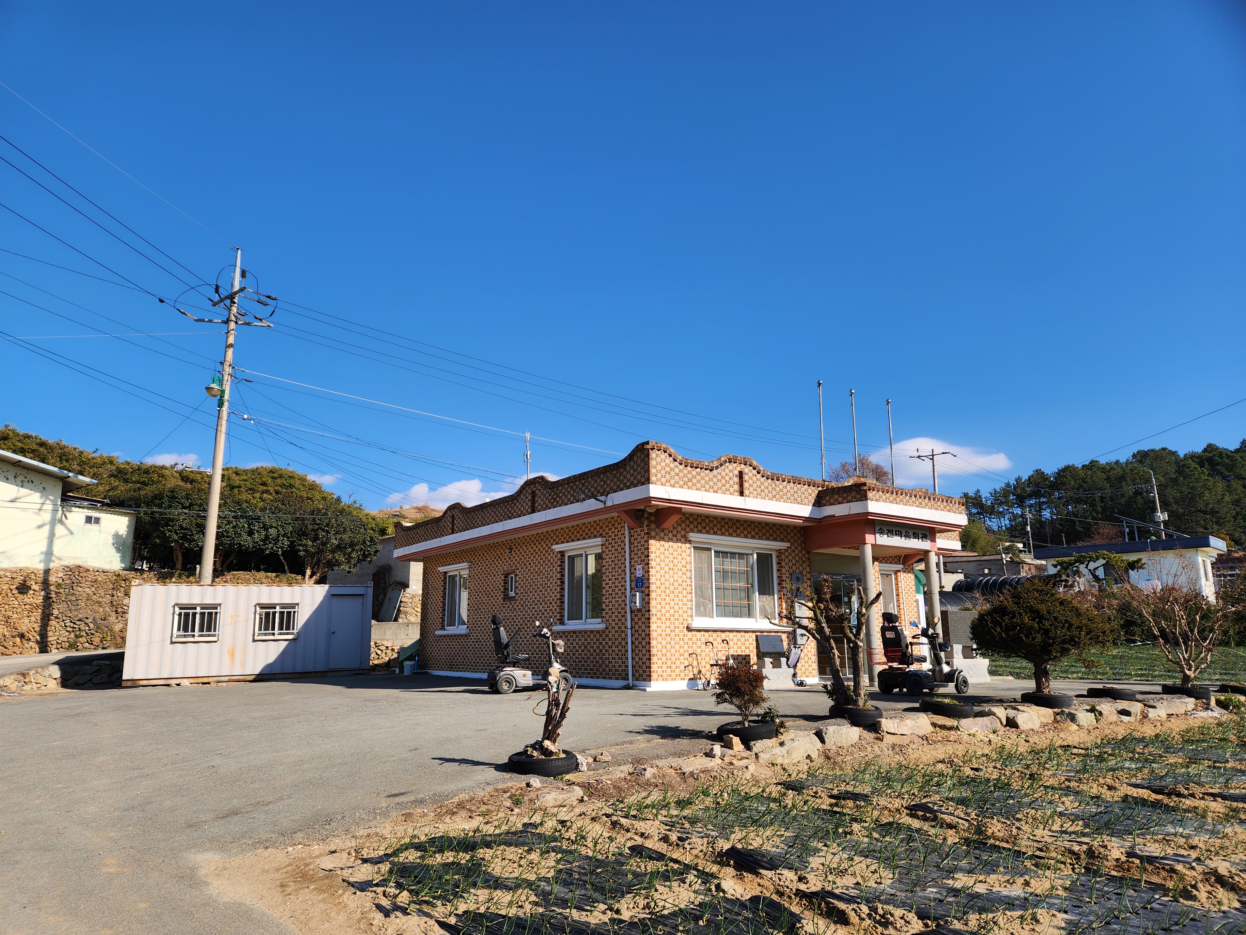 어르신들의 자가용이 회관앞에 주차 되어 있다.