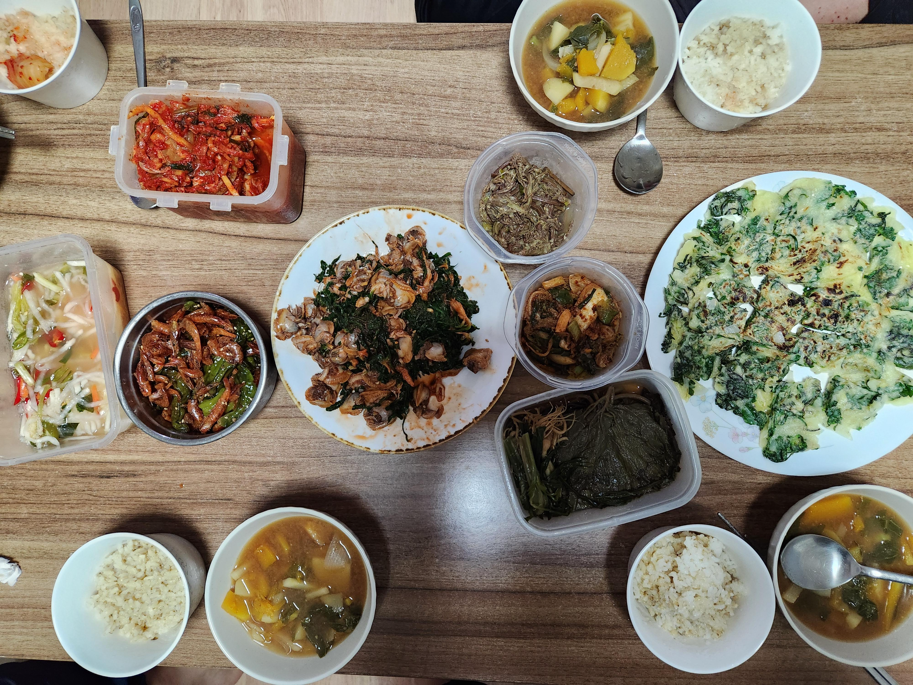 야채 된장국과 냉이 꼬막무침, 배추전과 냉이전 등으로