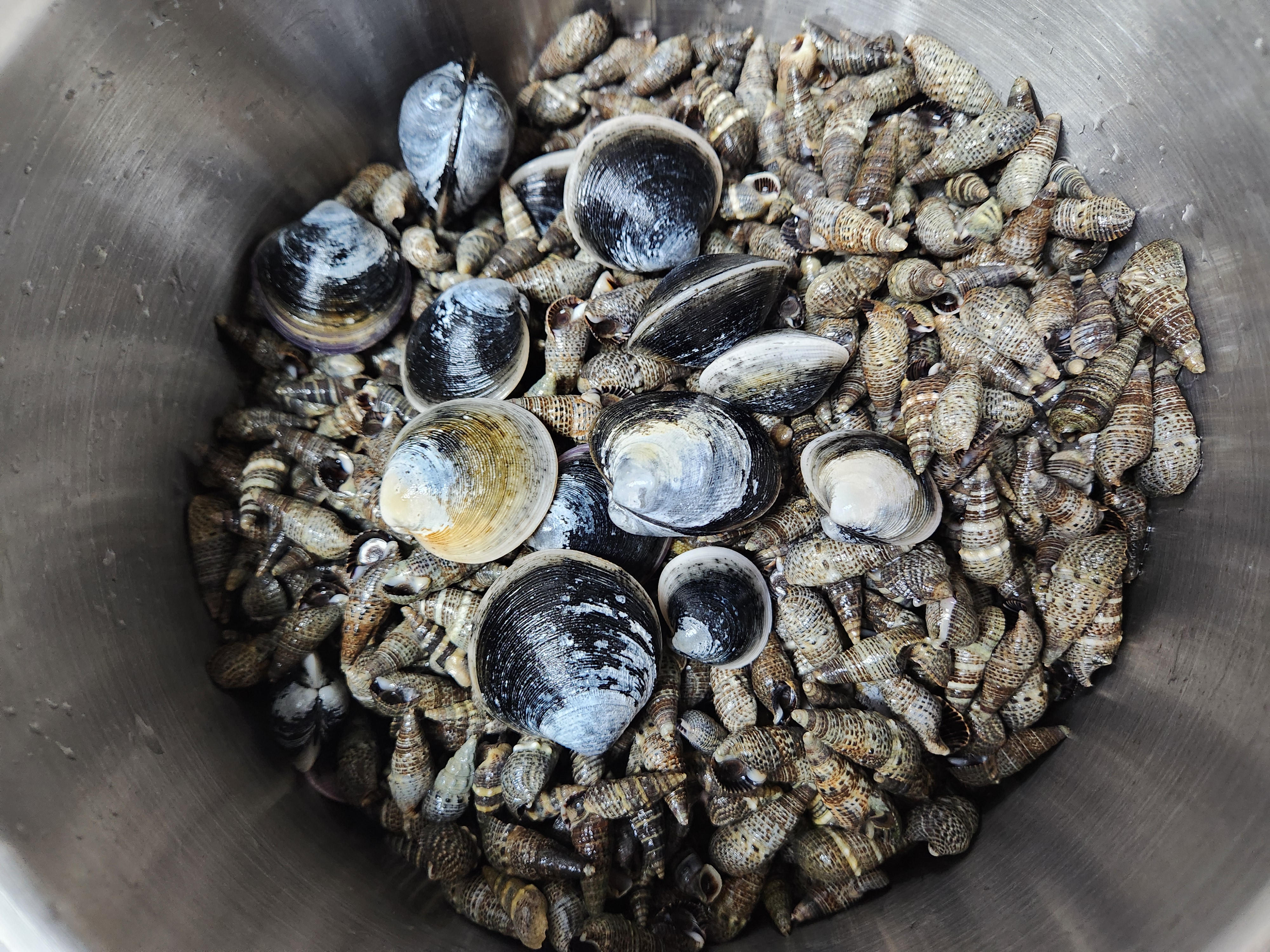 세사람이 산나게 잡아온 모시조개와 바다고동