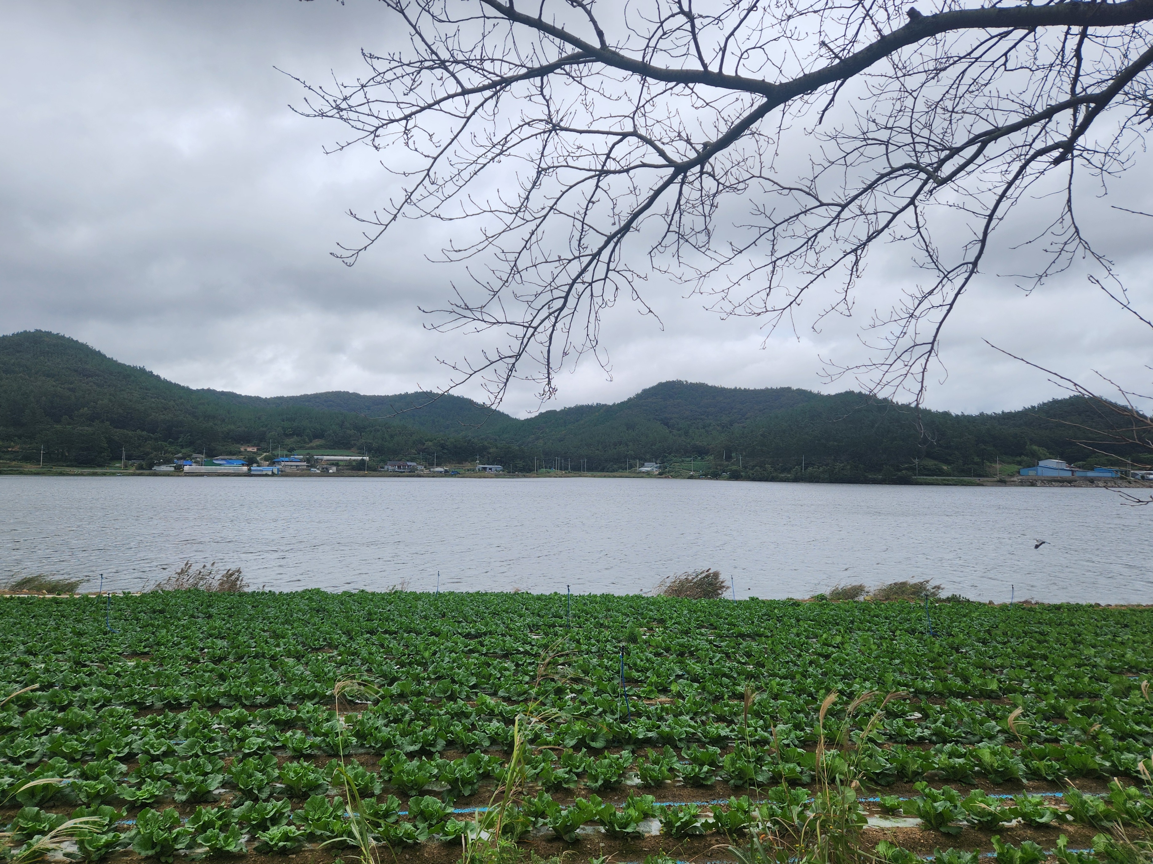 싱그런 배추밭 너머로 보이는 봉암저수지