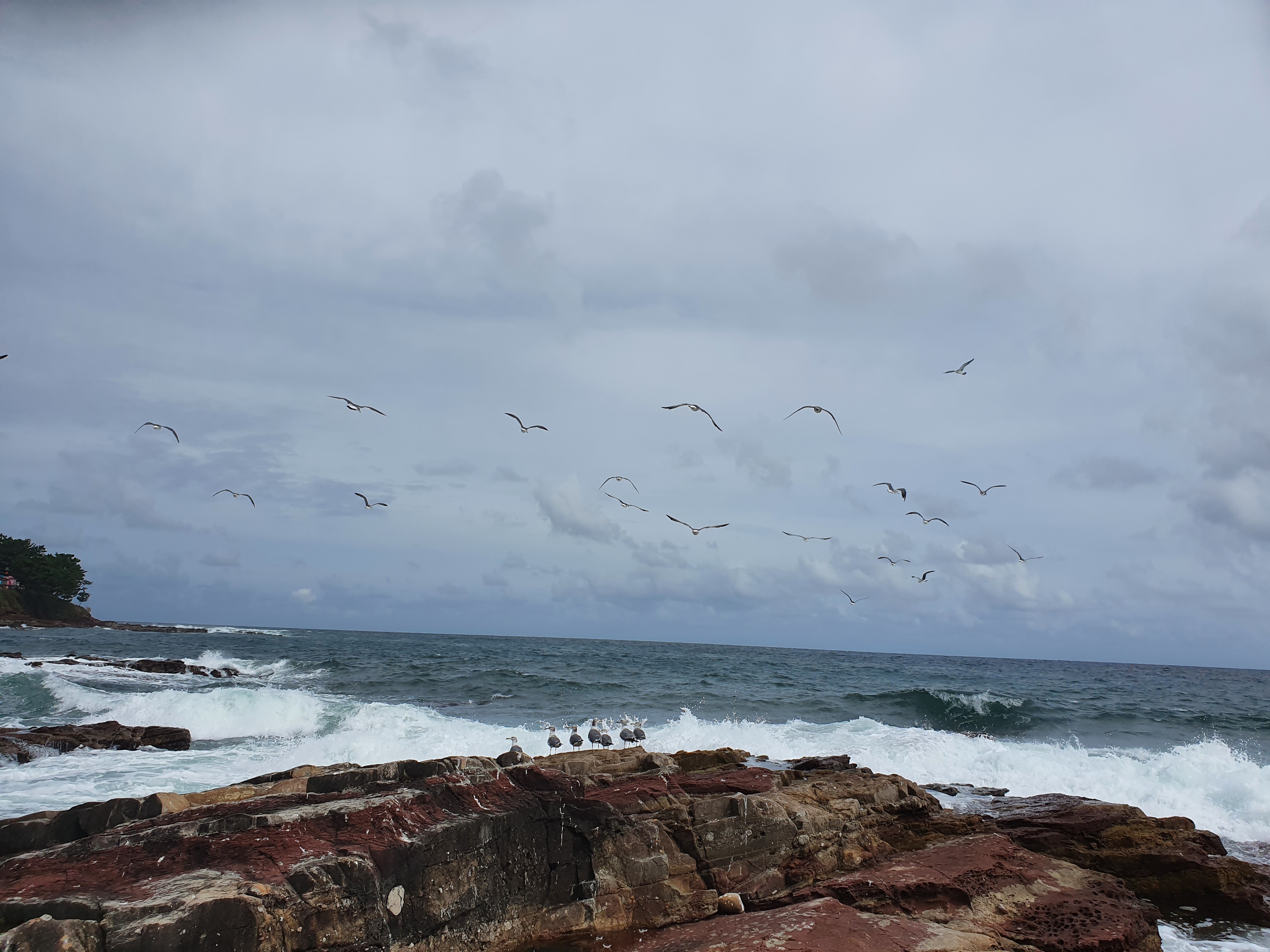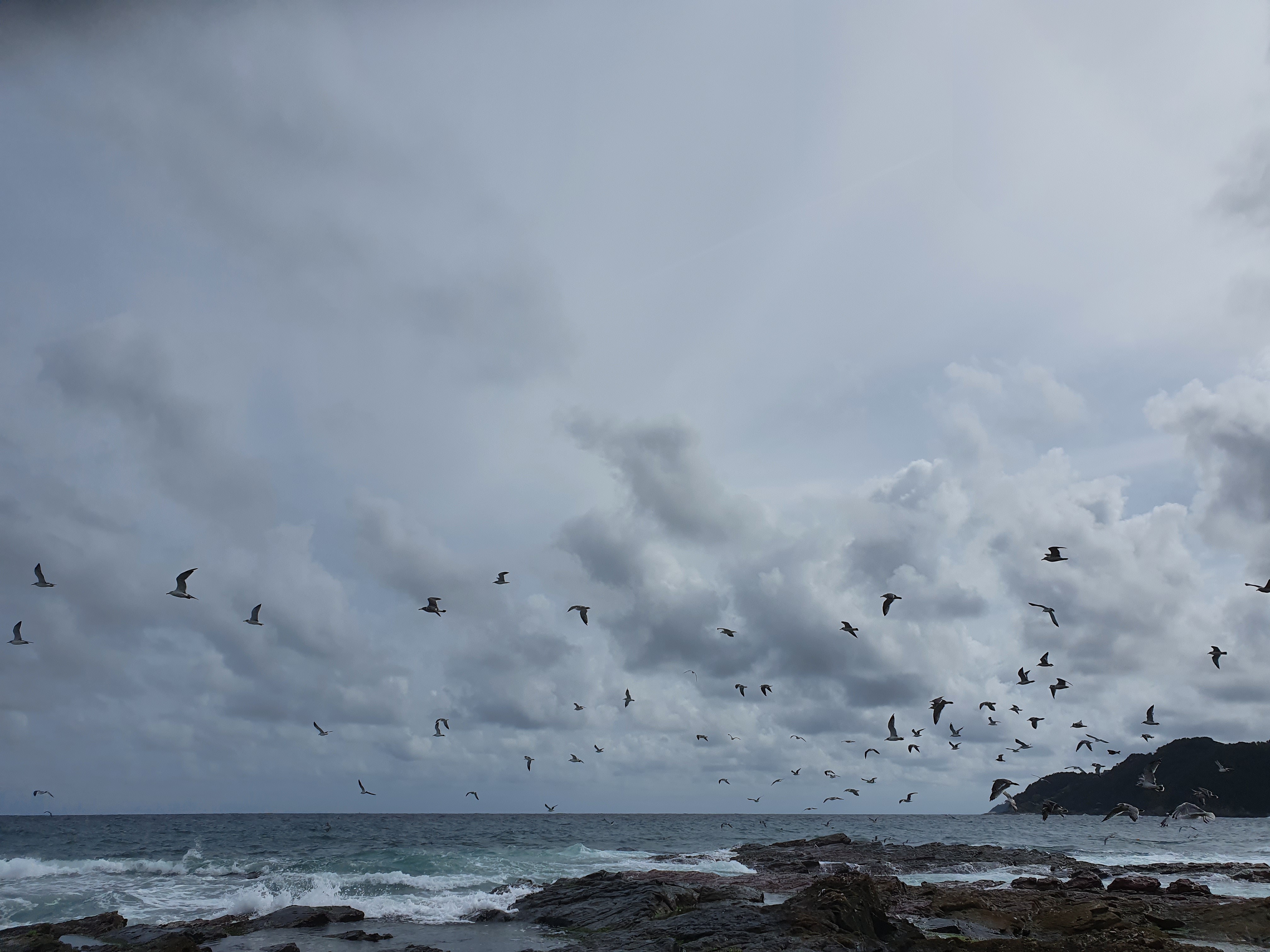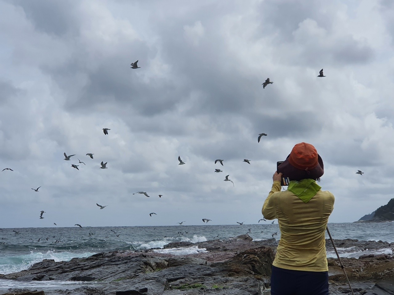 인기척에 놀란 갈매기들이 바위에서 일제히 날아 오른다.