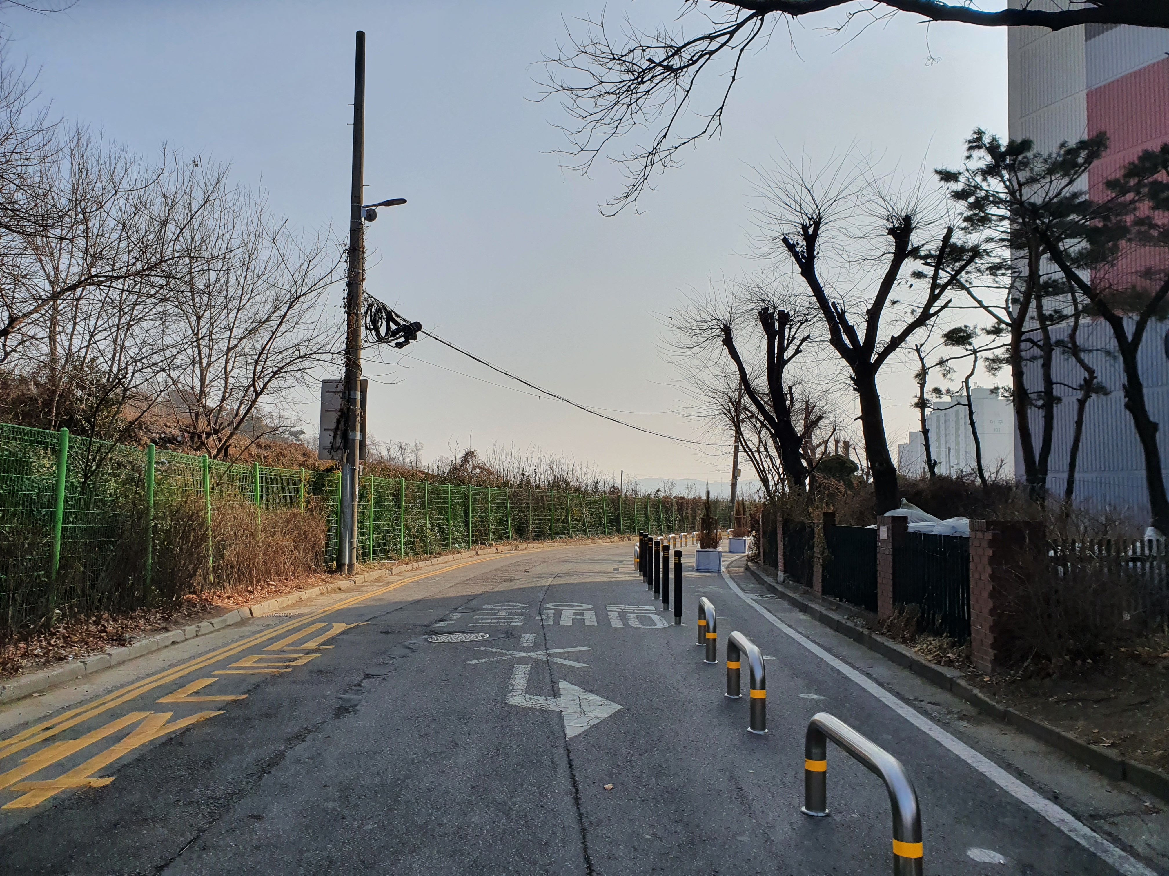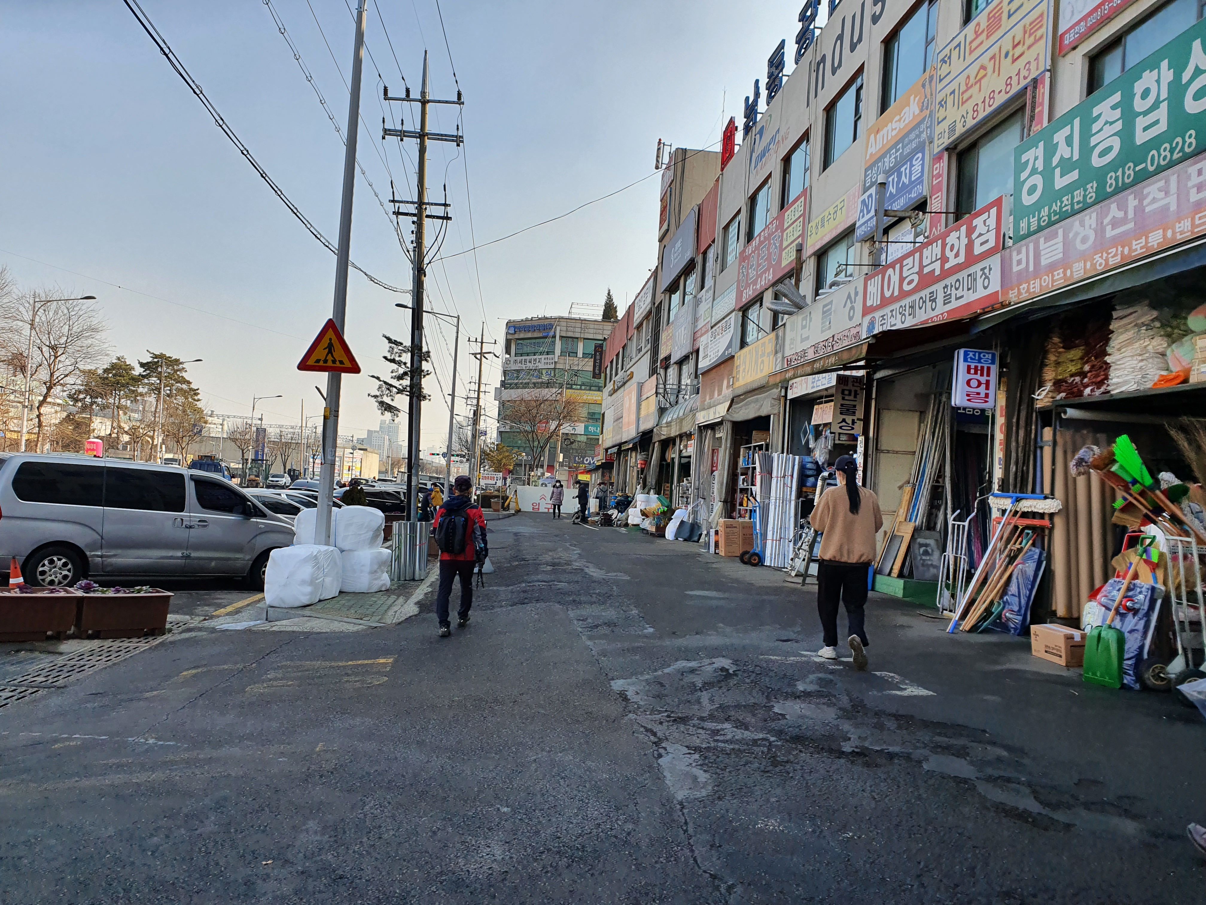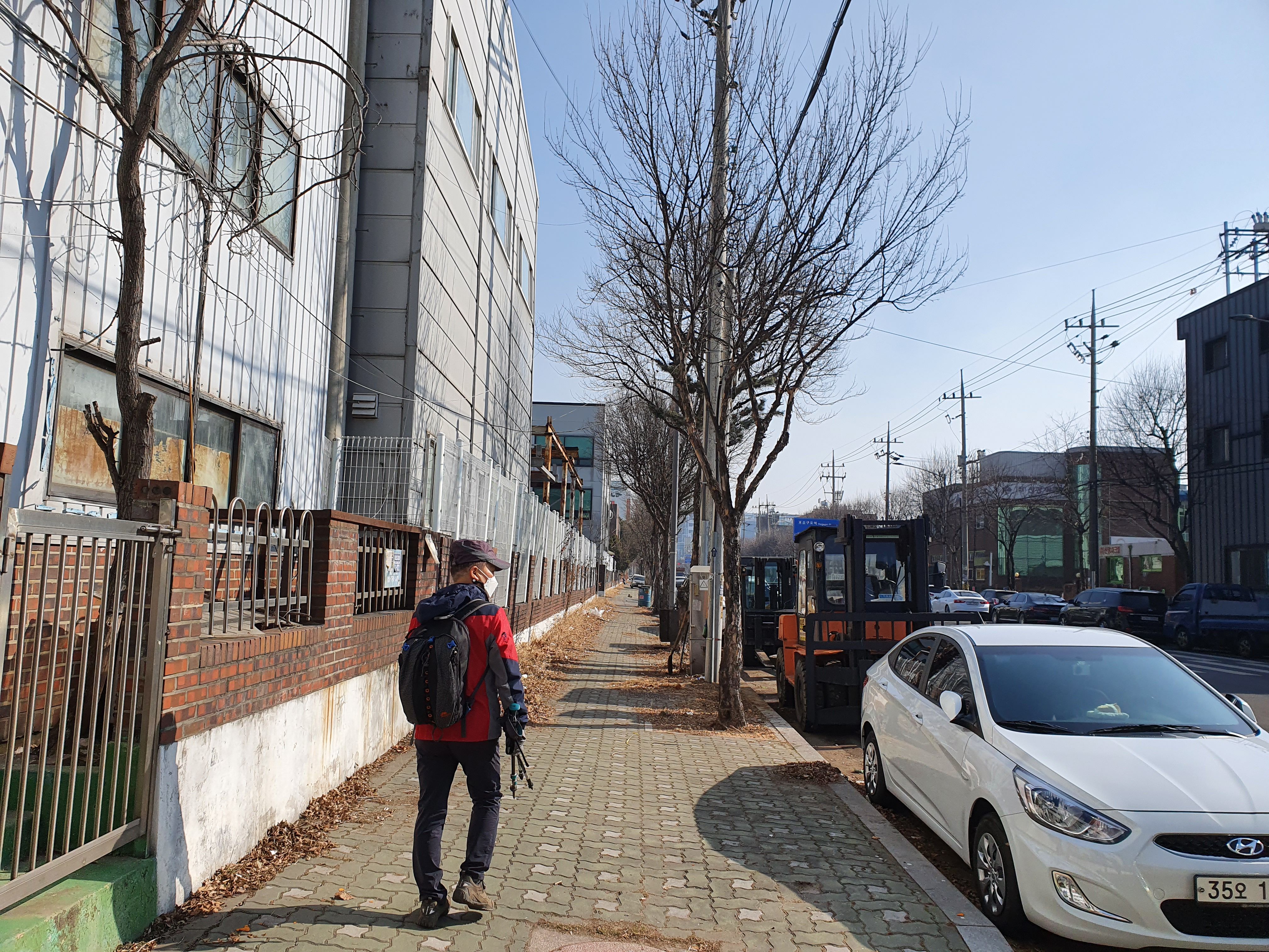 트럭과 화물차들이 어지럽게 주차되어 있는 승기천로