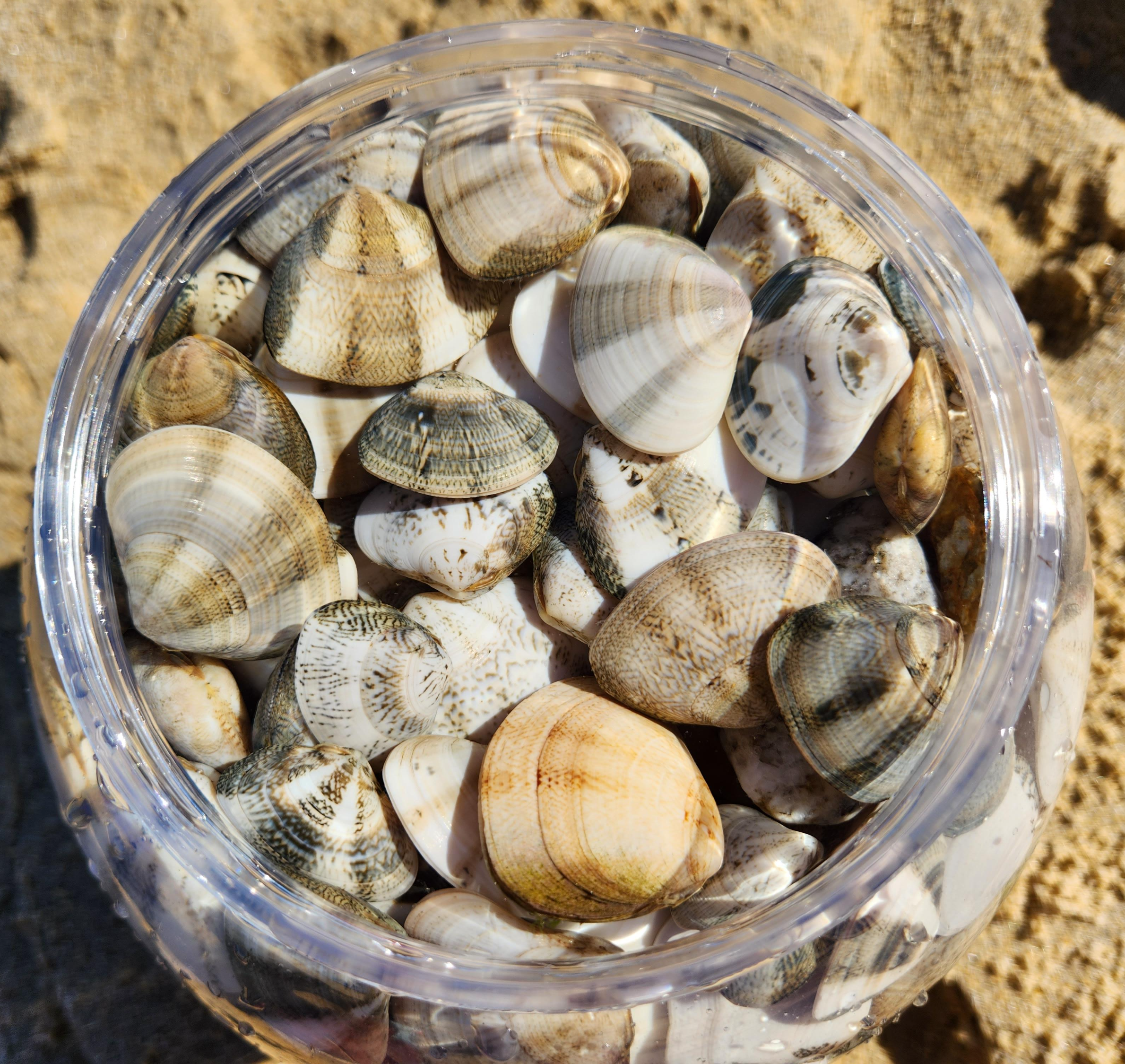 아지매들이 파도에 밀려온 조개를 정신없이 줍고 있다.